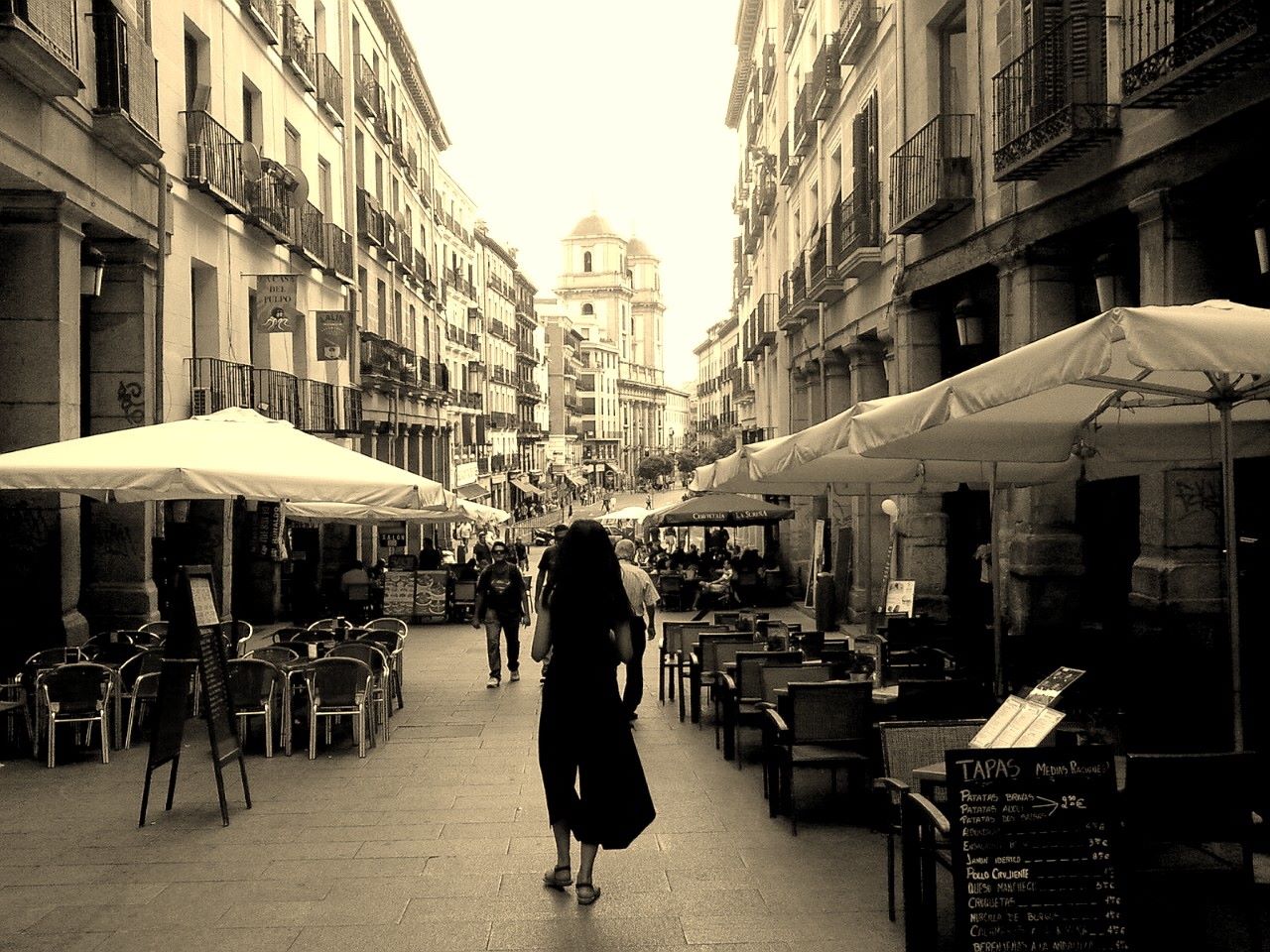 Sitting here in our apartment, a cozy, parquet-floored 1-bedroom affair, I can hear the babble of excited young voices below the window, a medley of idioms and accents; the clink of glasses and clatter of dishes from neighbouring restaurants; the smoky strumming of a flamenco guitar, the wheezy chorus of an accordion; the cries of Nigerian hawkers and Bengali street-peddlers, and the low hum of the occasional taxi cab, rolling along the cobbled streets of this lively old pedestrian barrio of the Spanish capital.