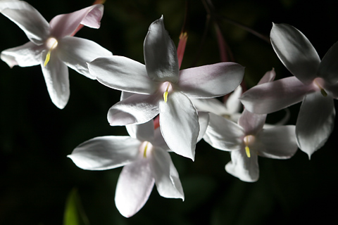She blinks, startled. Is it? It can’t be…bending forward, she buries her face in the modest little shrub bearing the two pale-faced flowers and takes a deep breath…