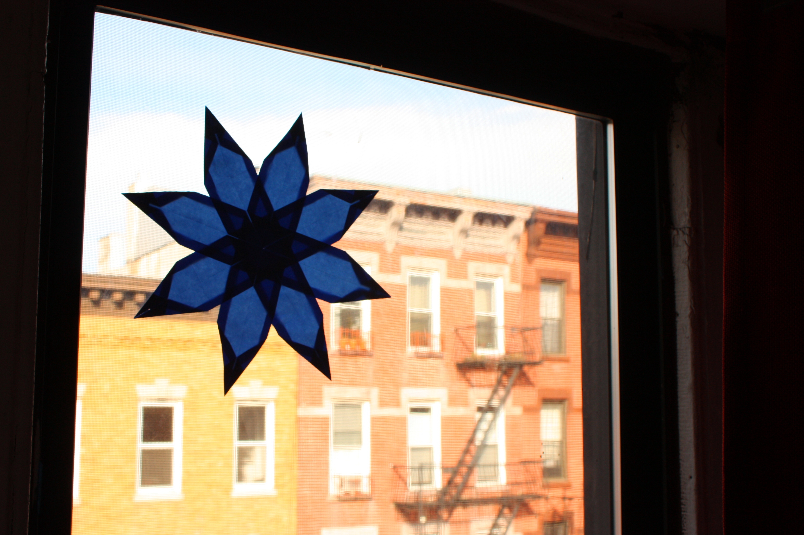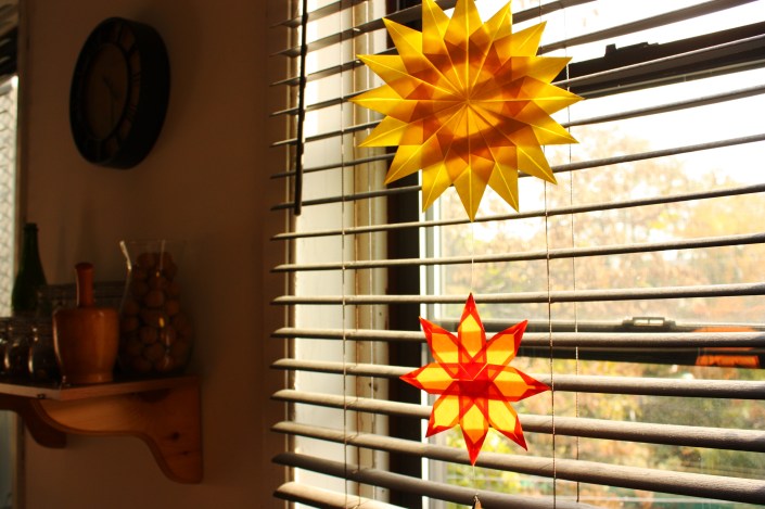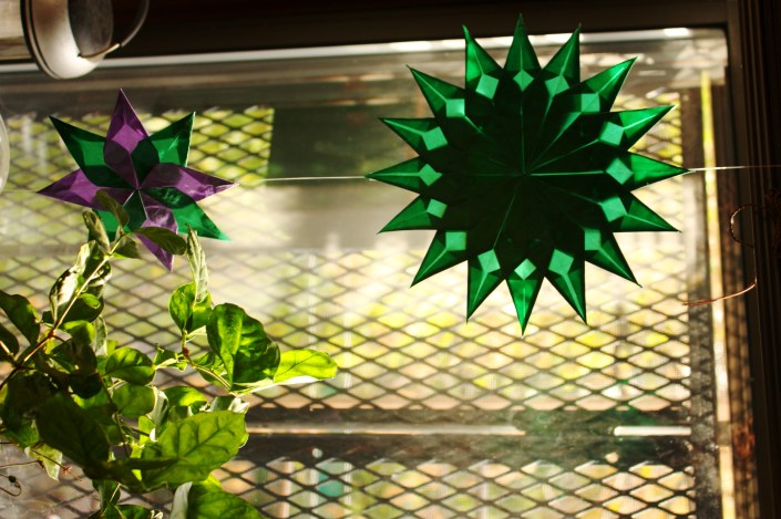 I bought an Origami Suncatchers Kit from Barnes & Noble on an impulse, and spent the next one week bent over a coffee table strewn with colourful glazed paper, glue and fishing string. Z would find me in the exact same position every time he came home from work – the house fell into a state of neglect, dinner was reduced to pita and hummus, episodes of the Colbert Report backed up…and voila! The prettiest things to have come out of a thoroughly home-bound day :)